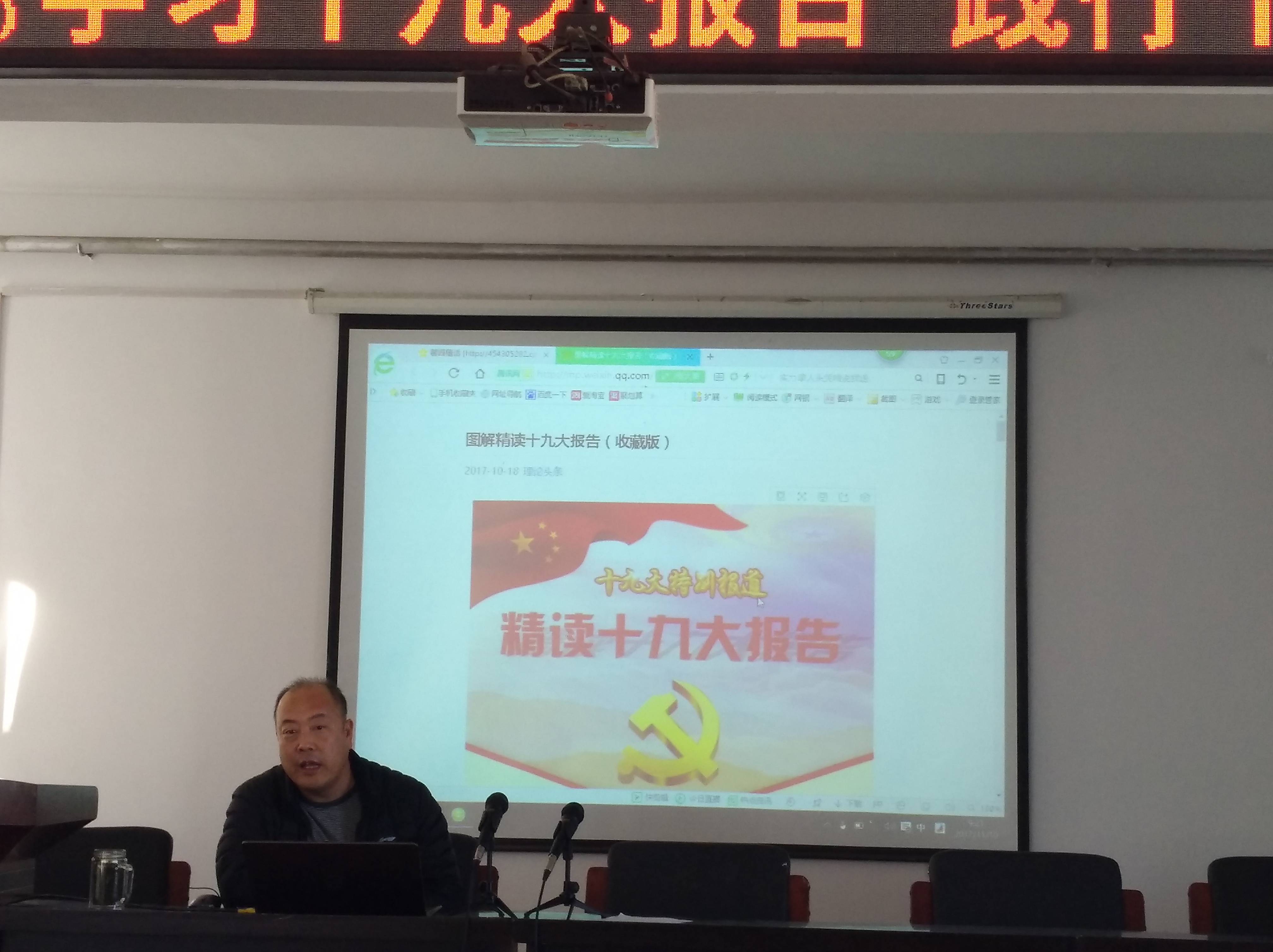 九大报告 践行十九大精神”全体党员及积极分子大会。会上党支部书记齐会来对于十九大报告进行了详细解读,使广大党员及积极分子明确了大会的主题,了解了中国特色社会主义进入了新时代,知道了我国社会主要矛盾已经转化为人们日益增长的美好生活需要和不平衡不充分的发展之间的矛盾等等有关十九大报告的内容。会后齐书记将学习材料发到学校工作群中,要求广大教师都要认真学习,并认真做笔记。