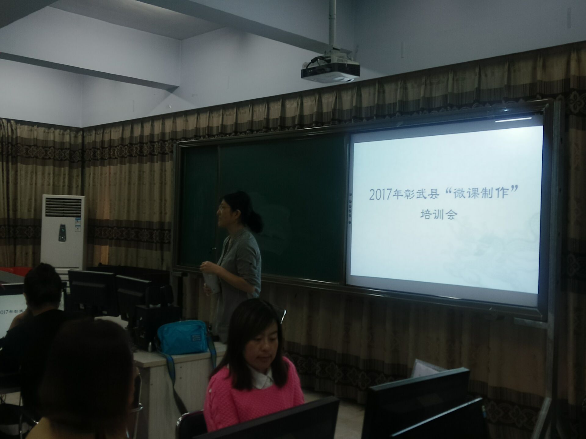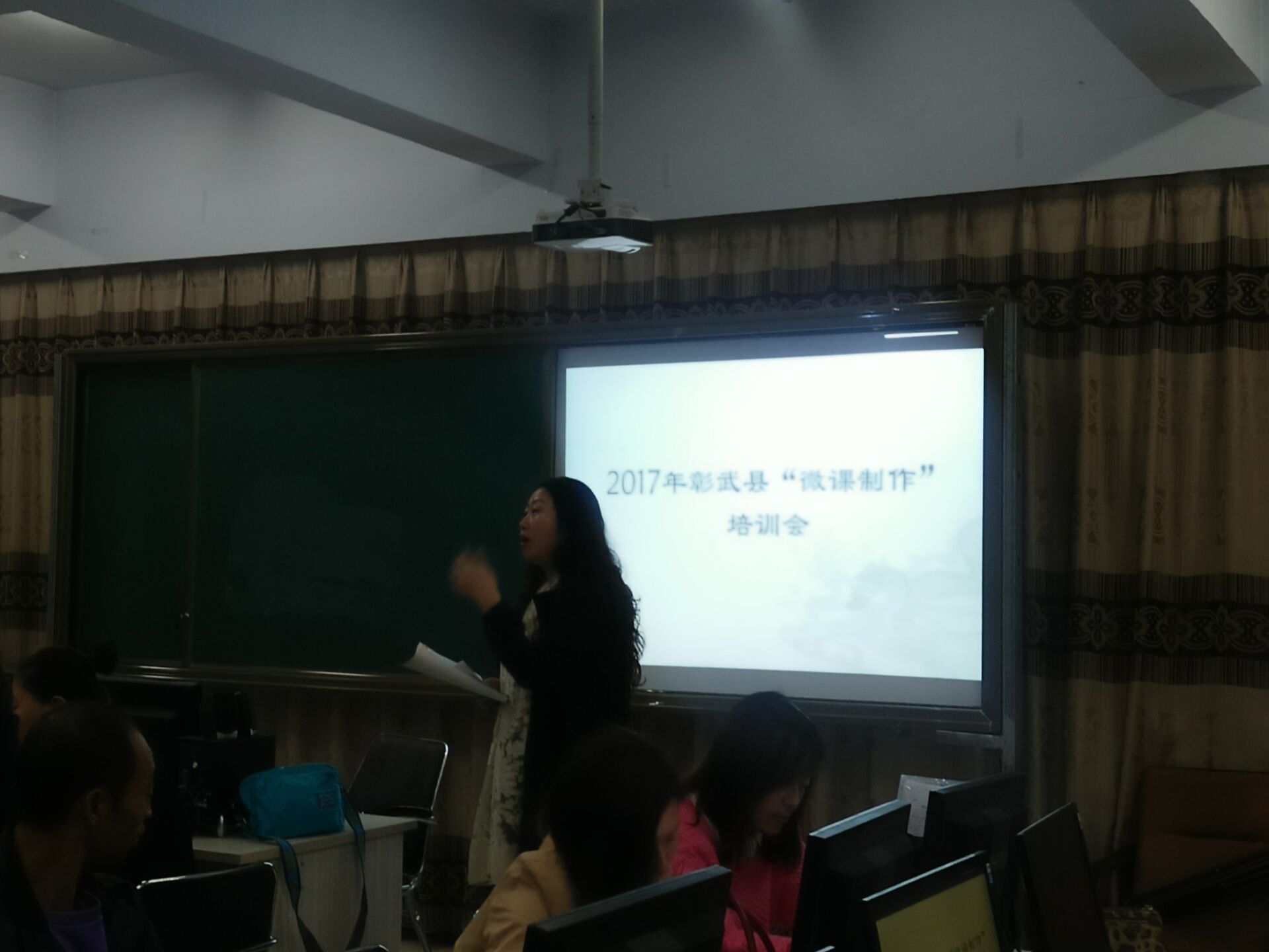 在总结前两次录制的经验后,为了能够再次提高本次微课录制的质量,我县于2017年9月26日请市电教馆教研部张瑛主任、杨冬颖老师与赵明辉老师来我县进行培训。全县23所九年制学校与县内2所小学分别派优秀教师与技术人员参与此次培训。教师进修学校全体学科教研员也参加了此次培训。