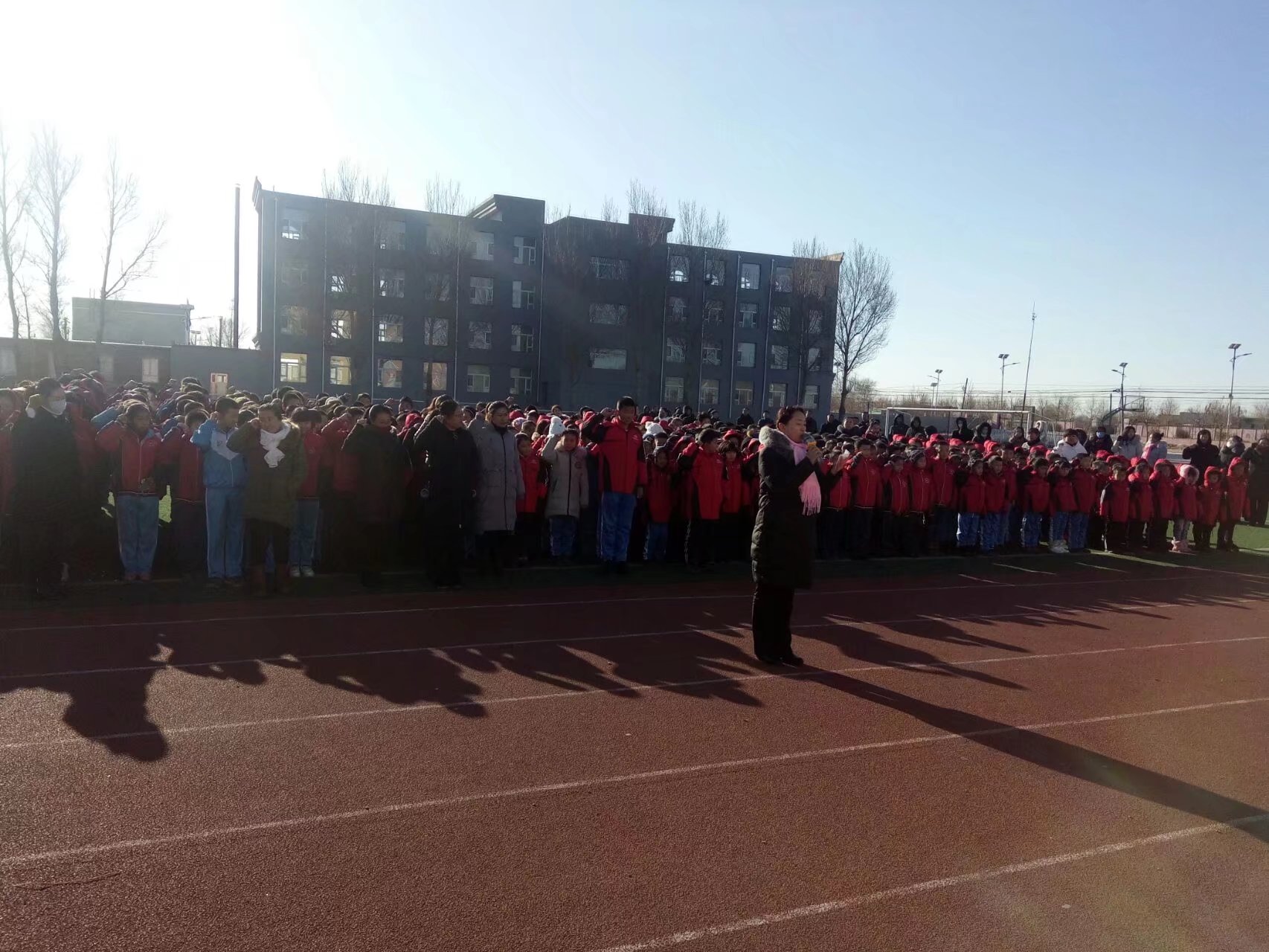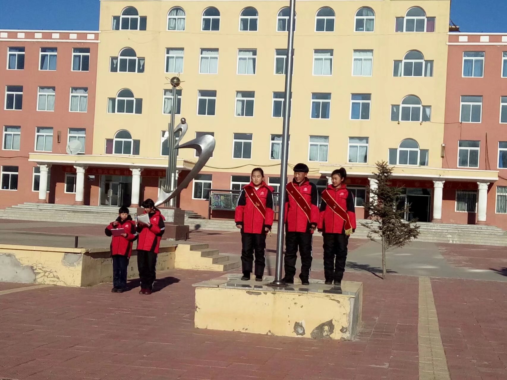 上午九时三十分,升旗仪式正式开始。天气虽寒,但八年二班的三名升旗手铿锵的步伐和整齐的动作,展现出对国旗的热情以及对宪法的忠诚。雄壮的国歌响起,全体师生庄严肃立,少先队员行队礼。
