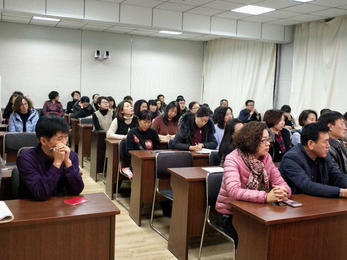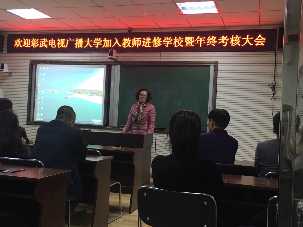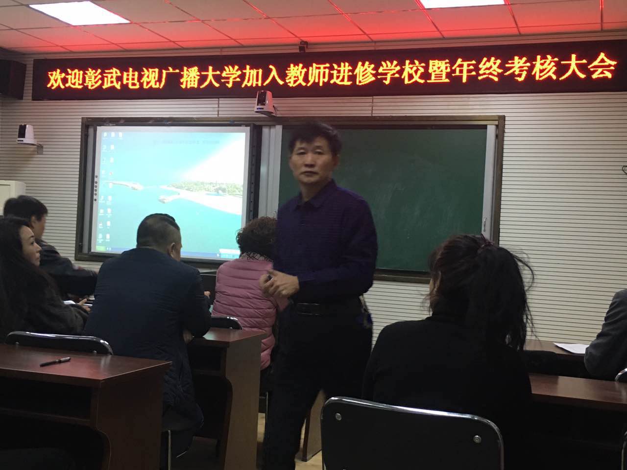 辛立东副校长主持欢迎彰武电视广播大学加入教师进修学校会议 尹晓华书记对电大加入教师进修学校致欢迎辞 李小侠校长对电大工作进行汇报 宫理校长做重要讲话 教师进修学校全体教师参加会议 (照片编辑:顾戬) 2017年12月25日,在彰武县教师进修学校二楼召开“欢迎彰武电视广播大学加入教师进修学校暨年终考核大会”,会议由教师进修学校副校长辛立东主持,会上尹晓华书记致欢迎辞,原电大副校长李小侠对电大回归教育,加入彰武教师进修学校做重要讲话,并对电大的发展与工作情况进行详细汇报,电大教师王冰梅、王晓丽、孙浩莹、张立秋、徐柏惠分别进行了自我介绍与工作汇报,教师进修学校宫理校长进行总结,同时强调对电大加入的后续工作要逐渐完善、各部门要互相协作。
